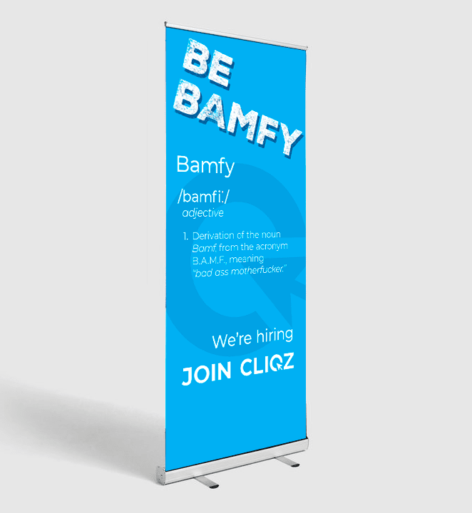 The word “bamfy” is funny to say and is likely to draw people closer; people would want to ask what the word means. Once they understand the joke, they will likely laugh. Starting a conversation with a smile and a laugh always makes the proceeding exchange far easier. The graphic captures the irreverent attitude of the company and would likely serve as a good icebreaker.